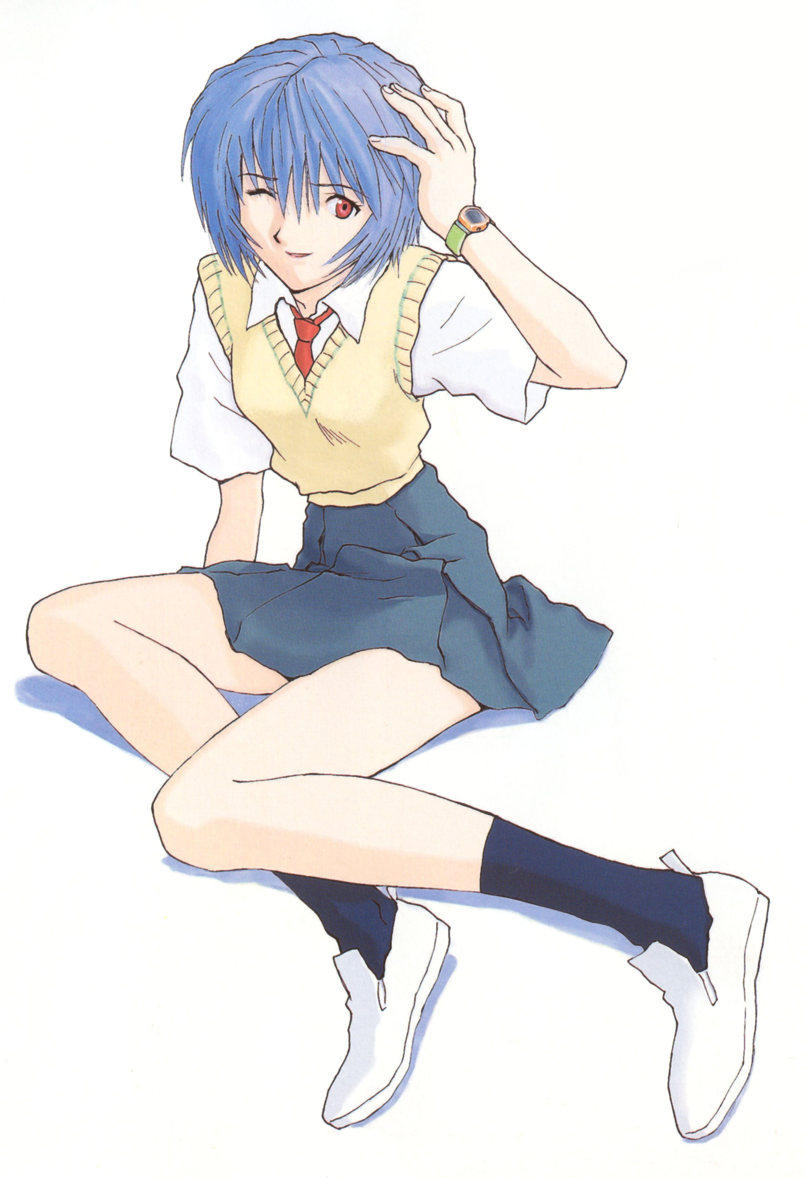 blue hairdress shirtnecktieone eye closedred eyesschool uniformshirtshort hairskirtsockssolosweater vestwatchwinkwristwatch