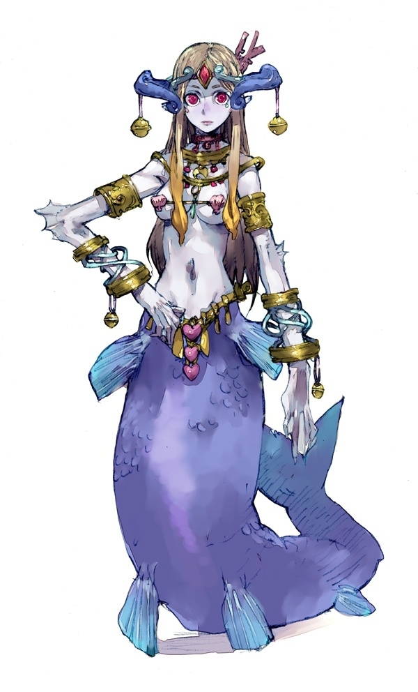 1girlarmletbeltbikiniblonde hairblue skinbraceletchokercircletcolored skinexpressionlessfemale focusfinsgradient hairhand on own hipheartjewelrylong hairlooking at viewermermaidmicro bikinimonster girlmulticolored hairnecklacered eyesscalesseashellshellshell bikinisimple backgroundsolostandingswimsuitwebbed handswhite background