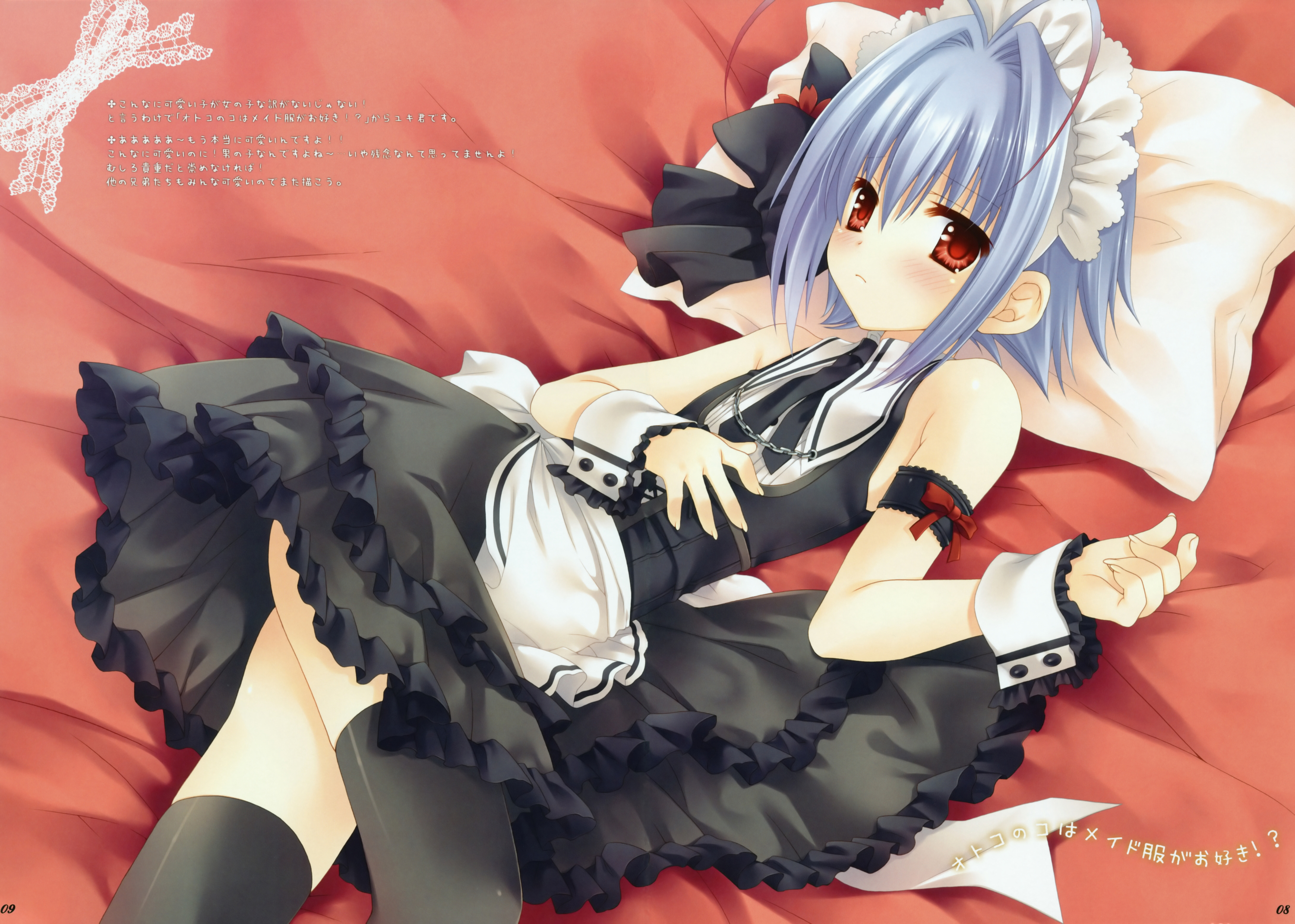 1boyblue hairblushcrossdressingcrossdressing (mtf)frillsgothic lolitahair ribbonlolita fashionlyingmaidmaid headdressmale focusmale maidnecktiepillowred hairribbonshort hairsolothighhighstrapwrist cuffszettai ryouiki