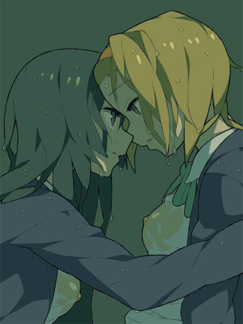 00s2girlsblack hairblonde hairbreastscovered erect nipplesgreen eyesmultiple girlsno braschool uniformsee-through clothesshirtsmall breastswetwet clotheswet shirtyellow eyesyuri