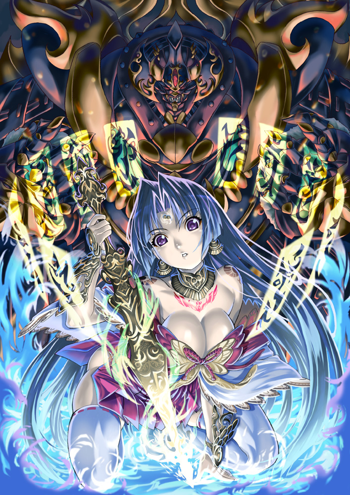 1girlblue hairbreastscleavagedressearringsfantasyfemale focusjewelrylarge breastslong hairmagicpurple eyessoloswordtattoothighhighsweapon