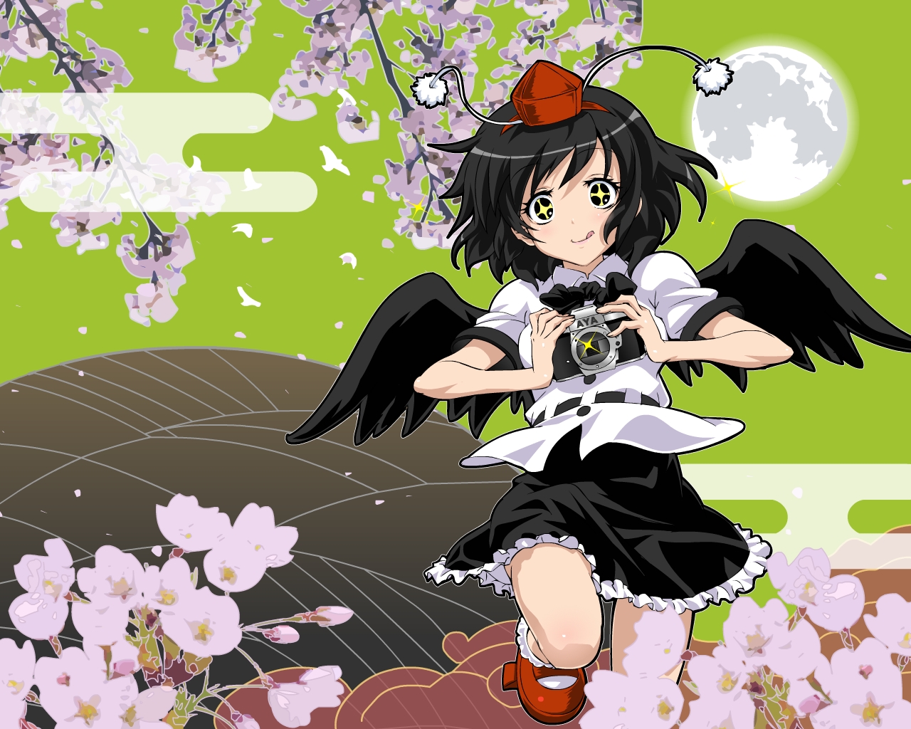 :q1boy1girlblack hairblack wingscameraegasumifemale focusflowergetahatmoonshort hairskirtsolotengu-getatokin hattonguetongue outwings