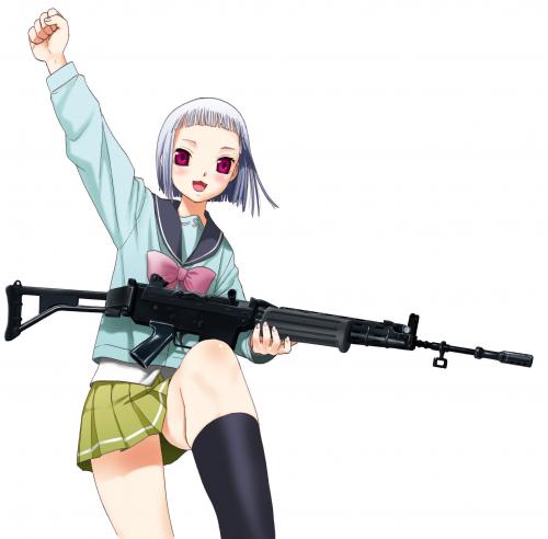 1girlassault rifleblack socksblushbob cutbowclenched handfemale focusfn fncgunkneehighspurple eyesraised fistrifleschool uniformserafukusimple backgroundskirtsockssoloweaponwhite background