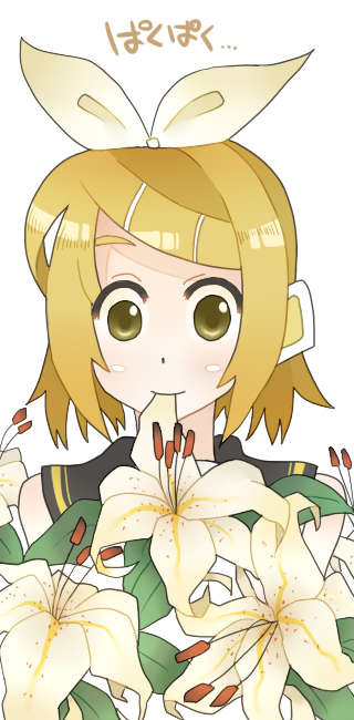 blonde hairflowerhair ornamenthair ribbonhairclipheadphoneslily (flower)ribbonshort hairsoloyamayuriyellow eyes