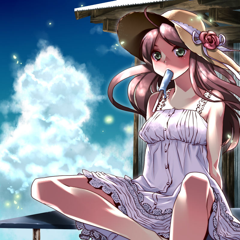1girlblushclouddaydressfemale focusfoodgreen eyeshatlong hairmeltingmouth holdpink hairpopsicleskirtskysleevelesssolostraw hatsummersundresswhite skirt