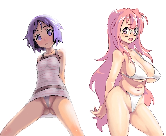 spdcooler, kasugano sakura, sagat, street fighter, street fighter ii (series), street fighter zero (series), bald, bandaged arm, bandages, blue shorts, blue skirt, brown hair, crossed arms, dress, eyepatch, fingerless gloves, gloves, headband, midriff peek, muscular, muscular male, pink background, sailor collar, sailor dress, scar, scar on chest, scar on face, shirtless male, short hair, shorts, skirt, waving