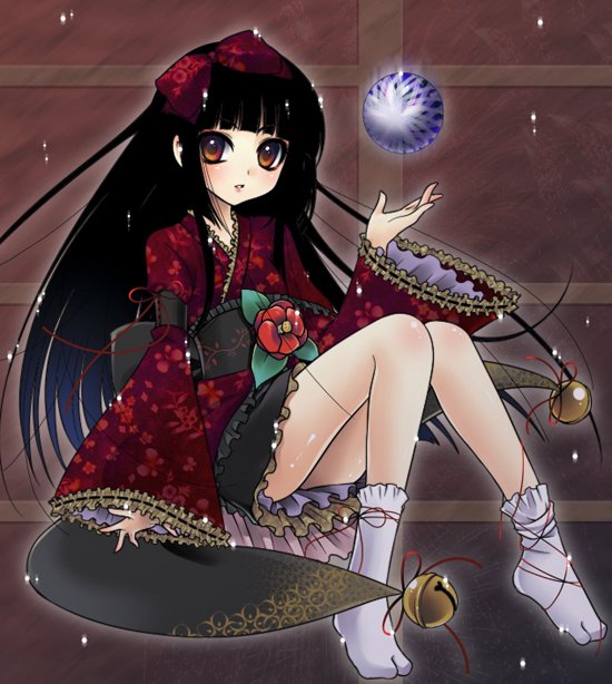 ballbellblack hairblunt bangsblushflowerhair ribbonhime cutjapanese clotheskimonololita fashionribbonsockssolowa lolitayellow eyes