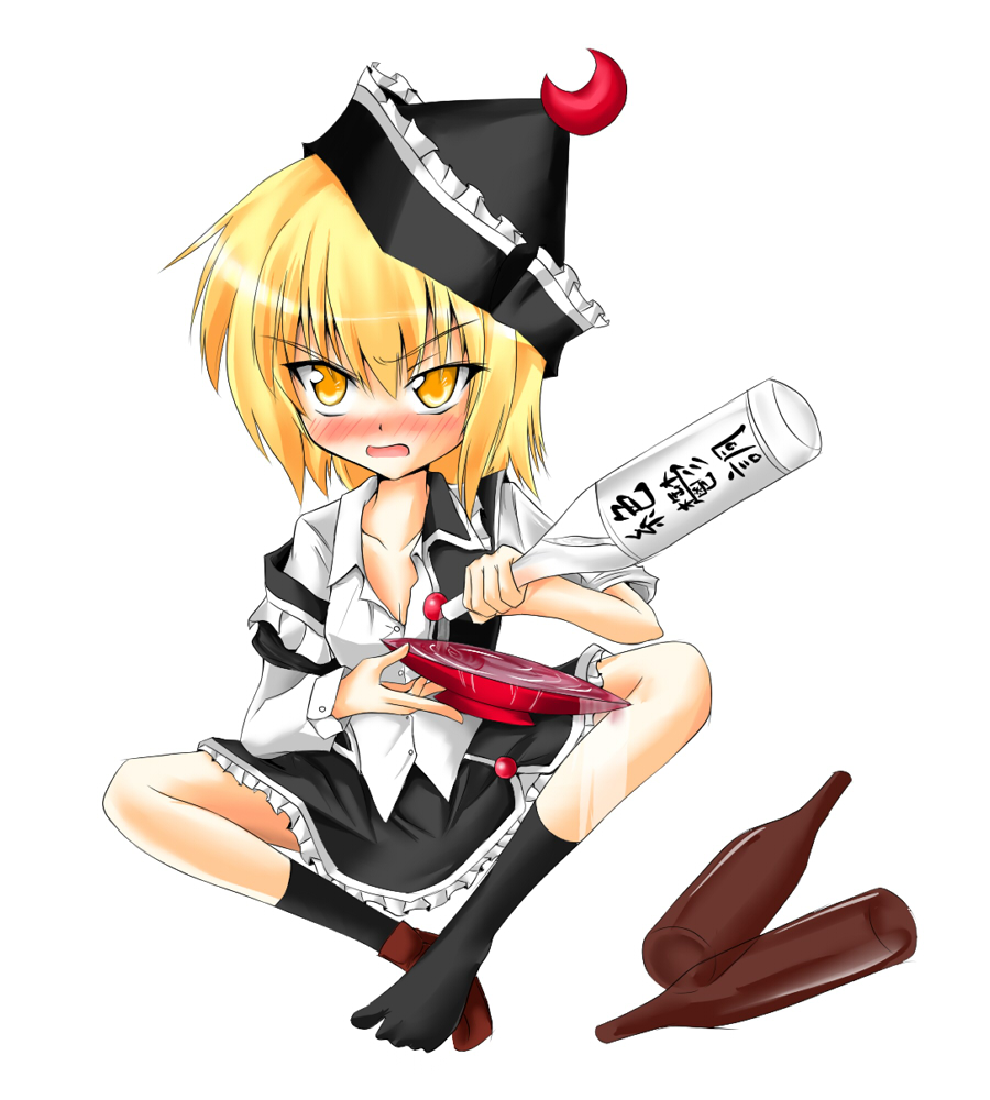 1girlblonde hairblushbottledrunkfemale focusfull bodyhatshoessimple backgroundsingle shoesockssolowhite backgroundyellow eyes