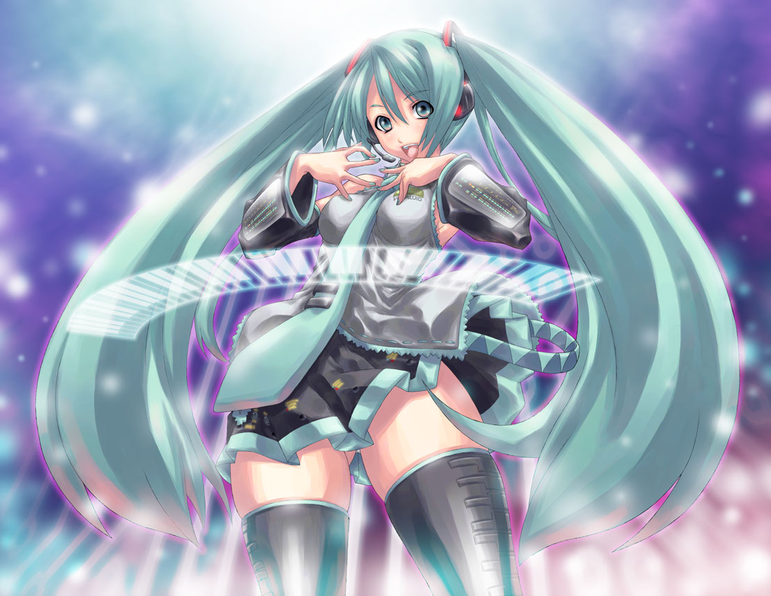 aqua eyesaqua hairdetached sleevesheadsetlong hairnecktieskirtsolothighhighstwintailsvery long hairzettai ryouiki