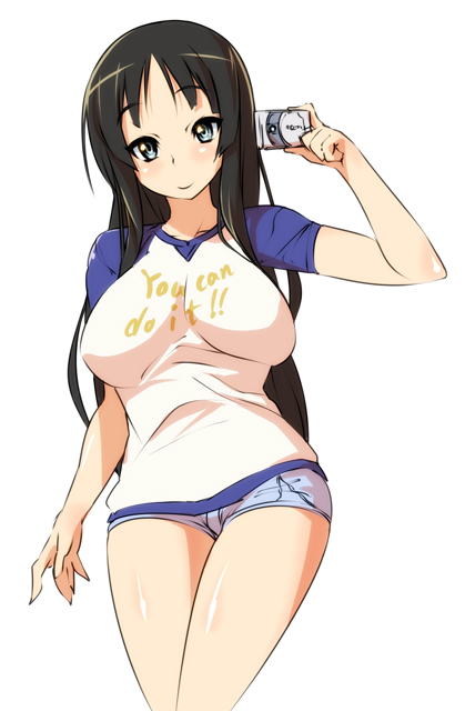 00s1girlblack hairblue eyesblunt bangsbreastscameraenglish textfemale focushime cutlarge breastsraglan sleevesshort shortsshortssmilesolothighs