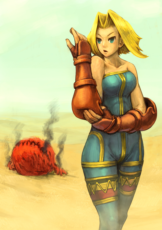 1girlbare shouldersblonde hairblue eyesbodysuitdesertelbow glovesfingerless glovesglovespantyhosesandshort hairunitard