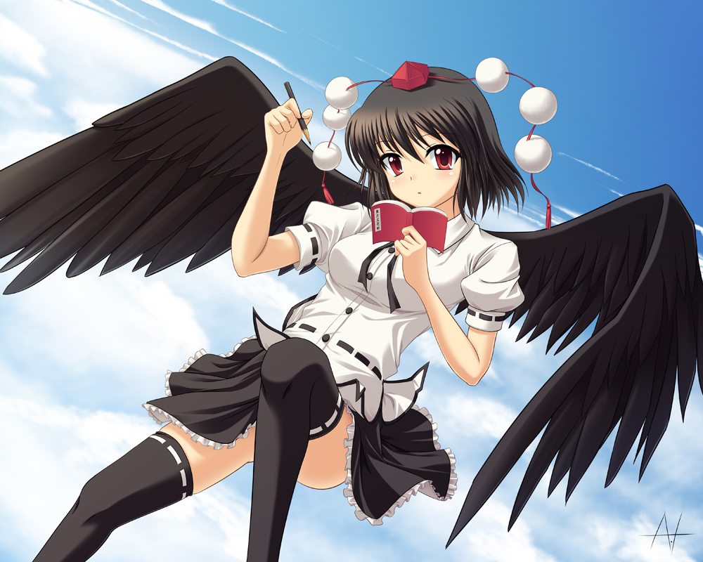 1girlblack hairblack wingsbreastsclouddayfemale focusflyinghatlooking at viewernotebookoutdoorspencilred eyesskirtskysolothighhighstokin hatwingswooden pencil