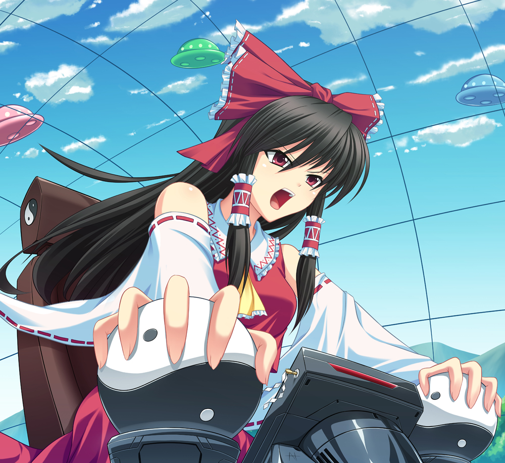 1girlblack hairbowcloudcockpitdaydetached sleevesfemale focushair bowjapanese clothesmikored eyesskysoloufoyin yang