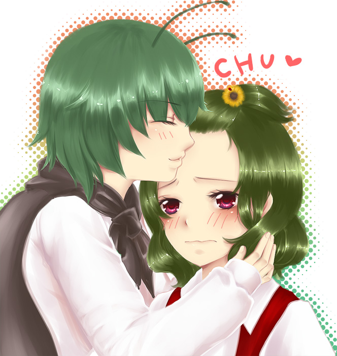 2girlsantennaeblushcapefemale focusflowerforeheadgreen hairkisskissing foreheadmultiple girlsportraitred eyesshort hairvestyuri