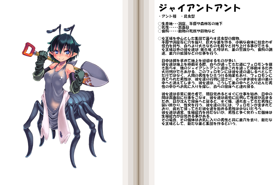 1girlanimal handsantant girlantennaearachnearthropod girlarthropod limbsblack hairblue eyesblushbugcharacter profileelbow glovesgauntletsglovesinsectinsect girlmonster girlpointy earsshort hairshovelsmilespider girltank toptaurtowelworktool