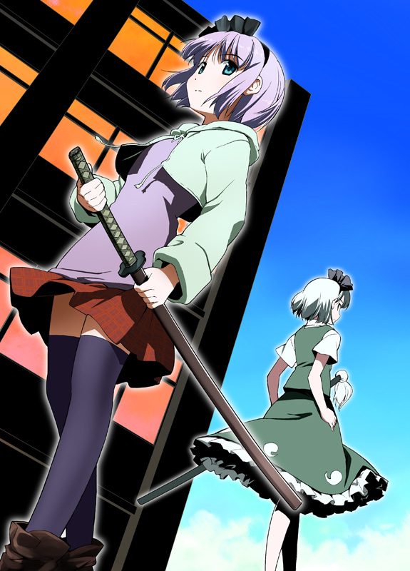 2girlsalternate costumecasualcloudcontemporarydual personafemale focuskatanamultiple girlsoutdoorsskirtskystandingswordthighhighsweaponzettai ryouiki
