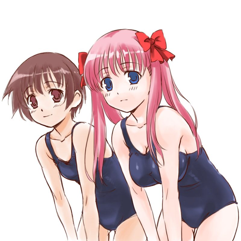 00s2girlsblue eyesbreastsbrown eyesbrown hairfemale focushair ribbonlarge breastsmultiple girlsone-piece swimsuitpink hairribbonschool swimsuitshort hairsimple backgroundsmall breastsswimsuittwintailswhite background