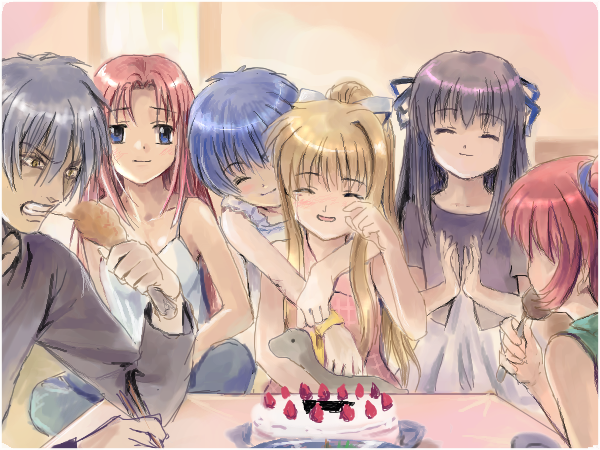 00s1boy5girlsbirdbirthdayblack hairblonde hairblue haircakechickenchicken (food)eatingfoodmultiple girlspastryred hairtears