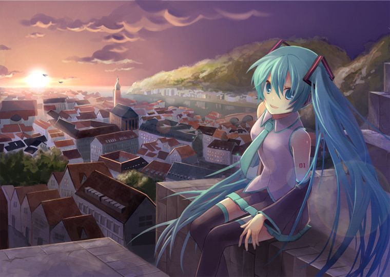 1girlaqua eyesaqua haircityscapedetached sleevesfemale focusheadphoneslong hairnecktiescenerysittingsmilesolosunsetthighhighstwintailsvery long hairzettai ryouiki