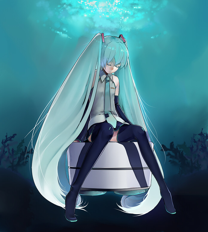 aqua hairclosed eyesdetached sleeveslong hairnecktieskirtsolothighhighstwintailsvery long hairzettai ryouiki