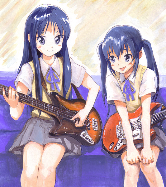 tenhiro naoto, mecha rinrin, mecha rinrin (sister princess), rinrin (sister princess), sister princess, 00s, 2girls, :d, blue dress, brown eyes, cowboy shot, day, dress, field, food, fruit, gloves, goggles, goggles on head, grass, green eyes, long sleeves, looking at viewer, mandarin orange, multiple girls, open mouth, outdoors, own hands together, park, smile, white gloves, yellow dress