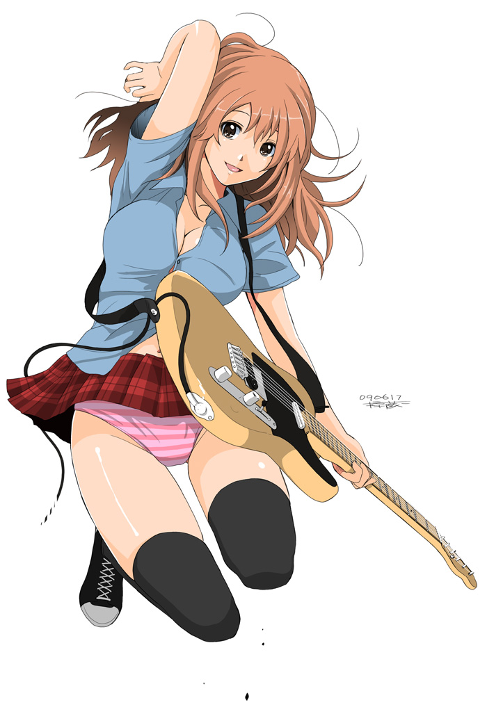 black thighhighsbreastsbrown eyesbrown haircablecleavageelectric guitarfender (company)fender telecasterguitarinstrumentlarge breastslong hairpantiespantyshotsimple backgroundsmilesolostriped clothesstriped pantiesthighhighsunderwear
