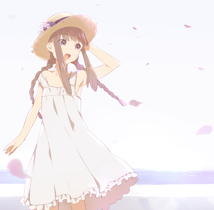 1girlarmpitsbare shouldersbraidbrown hairdouble toothdressfangfemale focushand on headwearhatlong hairpurple eyessidelockssolostrap slipstraw hatsundresstwin braids