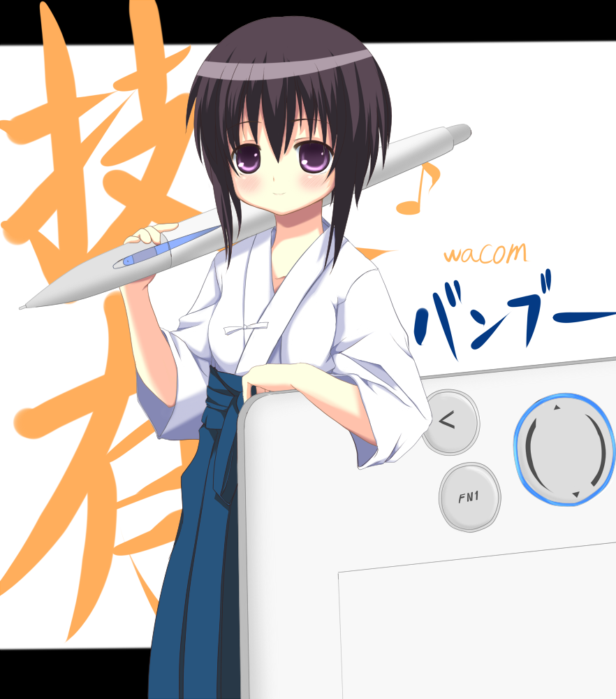 00s1girlarm supportblack hairblue hakamablushbob cutbrown hairdrawing tabletfemale focushakamahakama skirtjapanese clothesmusical noteoversized objectpurple eyesshort hairsidelocksskirtsolostylustext backgroundtext focus