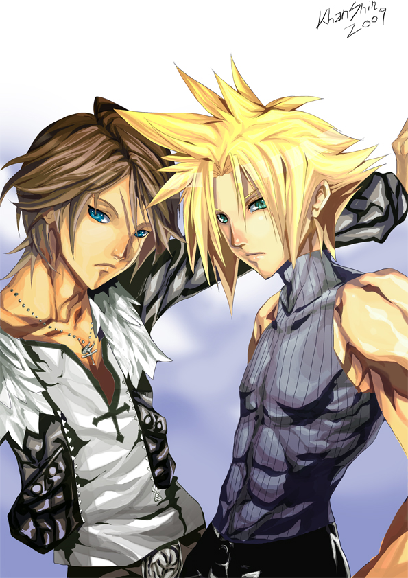 1990s (style)2boysbad anatomyblonde hairblue eyesbreastsbrown hairgreen eyesimpossible clothesimpossible shirtjewelrymale focusmultiple boysmuscularnecklaceretro artstylescarshirtshort hairsleevelesssleeveless turtleneckspiked hairturtleneck