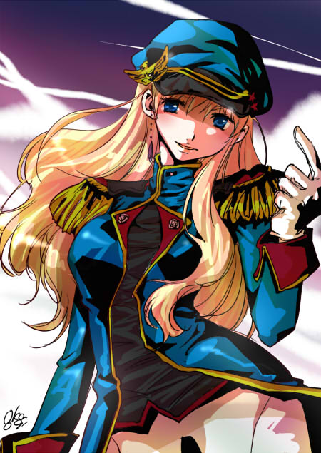 00s1girlblue eyescontrappostocowboy shotepaulettesfemale focusflat capgloveshathead tiltindex finger raisedlong sleevesmilitarymilitary uniformpink hairsolostandingwhite gloves