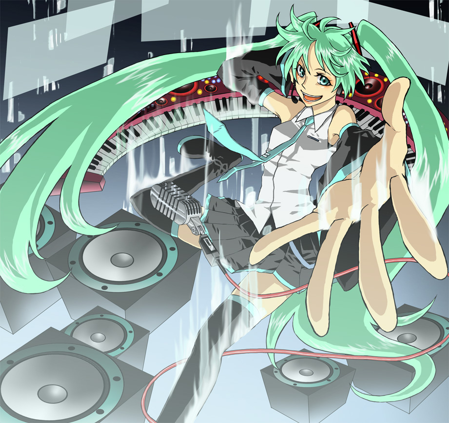 aqua eyesdetached sleevesgreen hairheadphonesinstrumentkeyboardkeyboard (instrument)long hairmicrophonenecktieskirtsmilesolothighhighstwintailsvery long hairzettai ryouiki