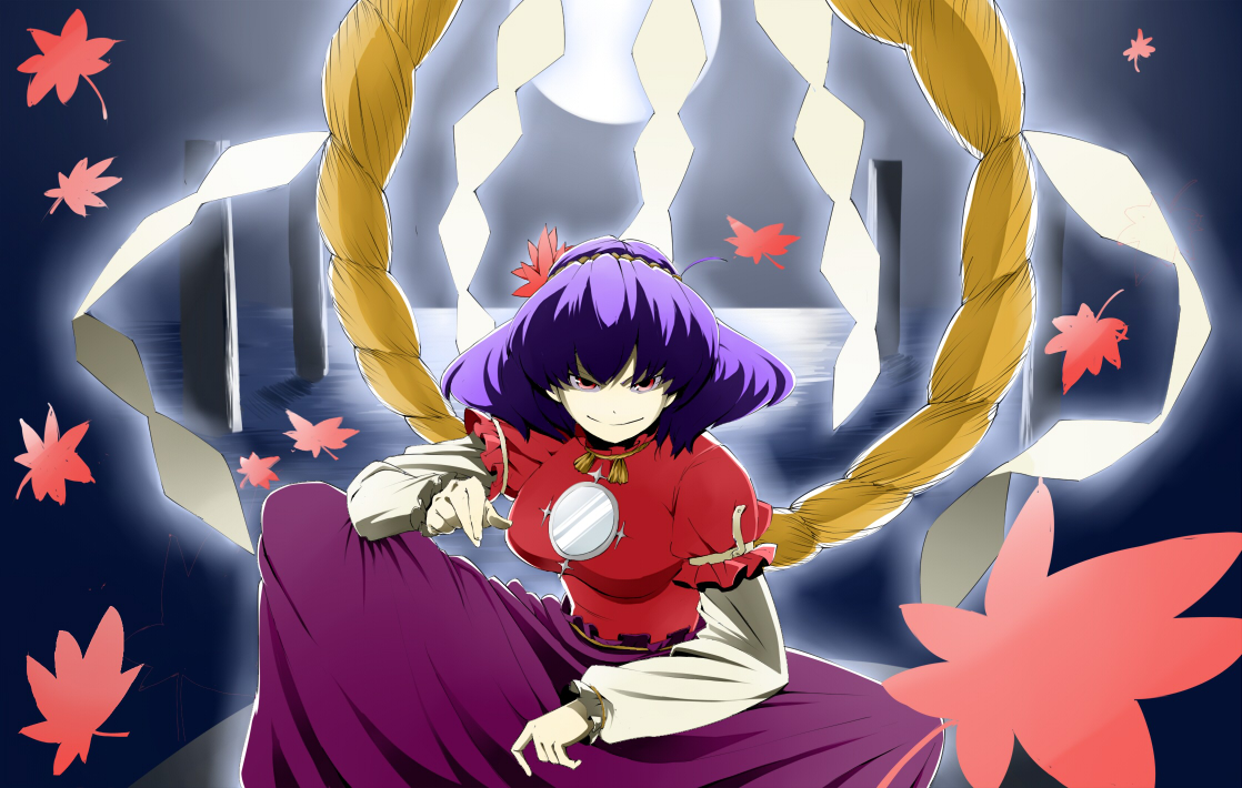 1girlfemale focushair ornamenthairbandleafleaf hair ornamentmirrorpurple hairred eyesropeshideshimenawashort hairsmilesolo