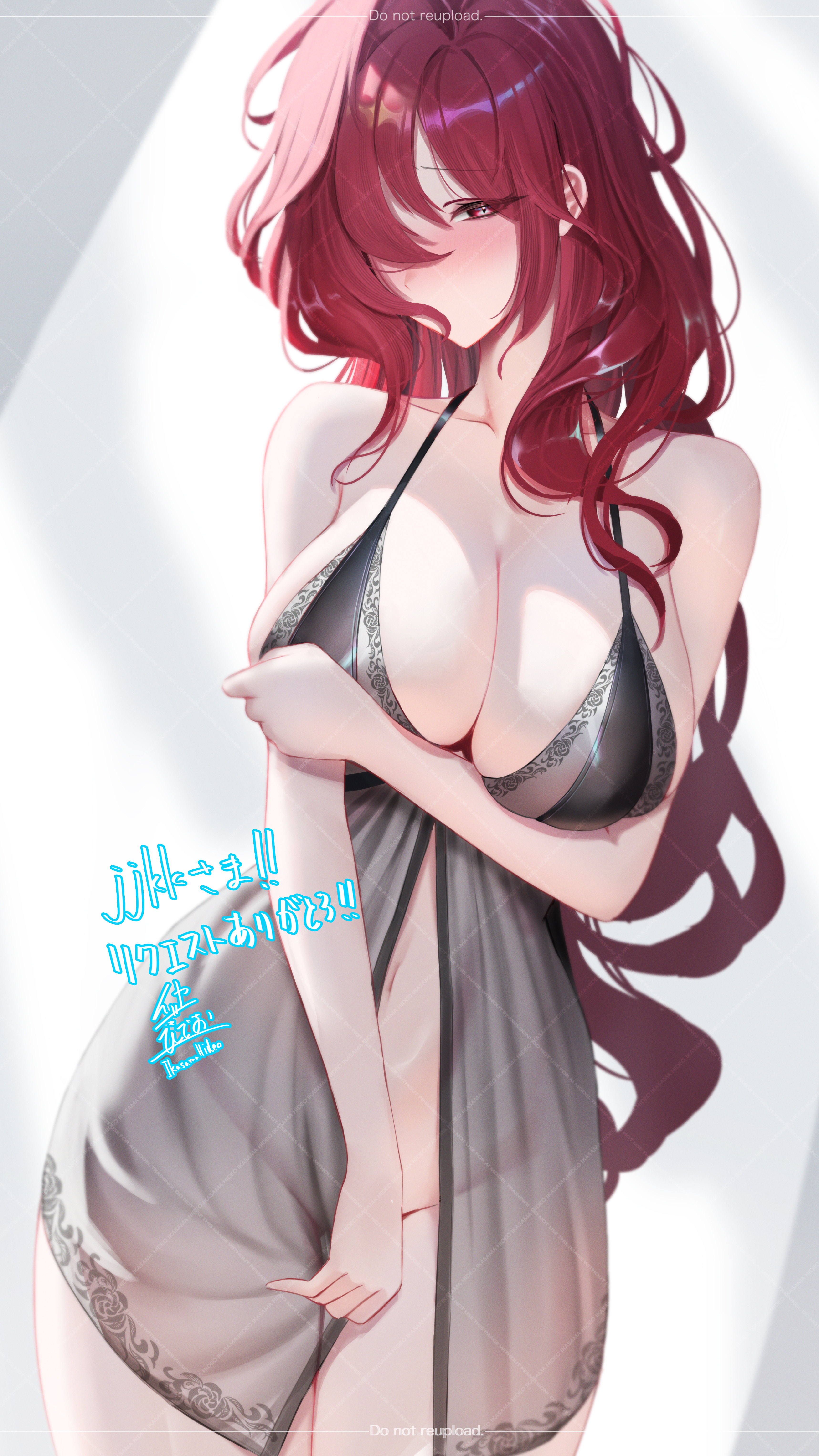 1girlbabydollbare shouldersblack babydollblushbreastsbulgecleavagecollarbonecowboy shotembarrassederectionerection under clothesgroinhair over one eyelarge breastslingerielong hairlooking at viewernavelno pantiesred eyesred hairsee-through clothessignaturesimple backgroundsolounderwearunderwear onlyvery long hairwhite background
