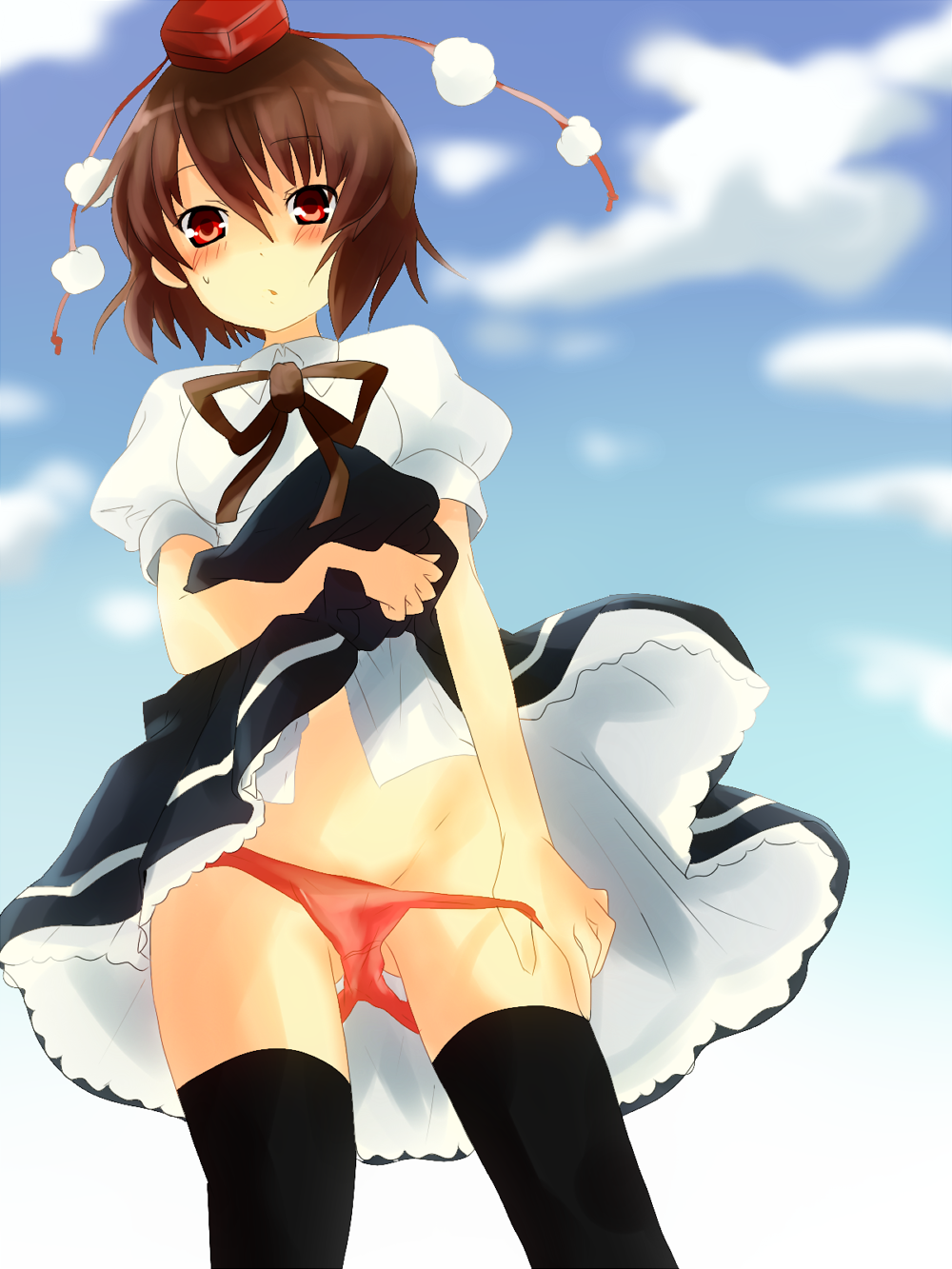 1girlblack thighhighsblushbrown hairclothes liftfemale focushatoutdoorspantiespanty pullred eyesshort hairskirtskirt liftskysolothighhighstokin hatunderwear