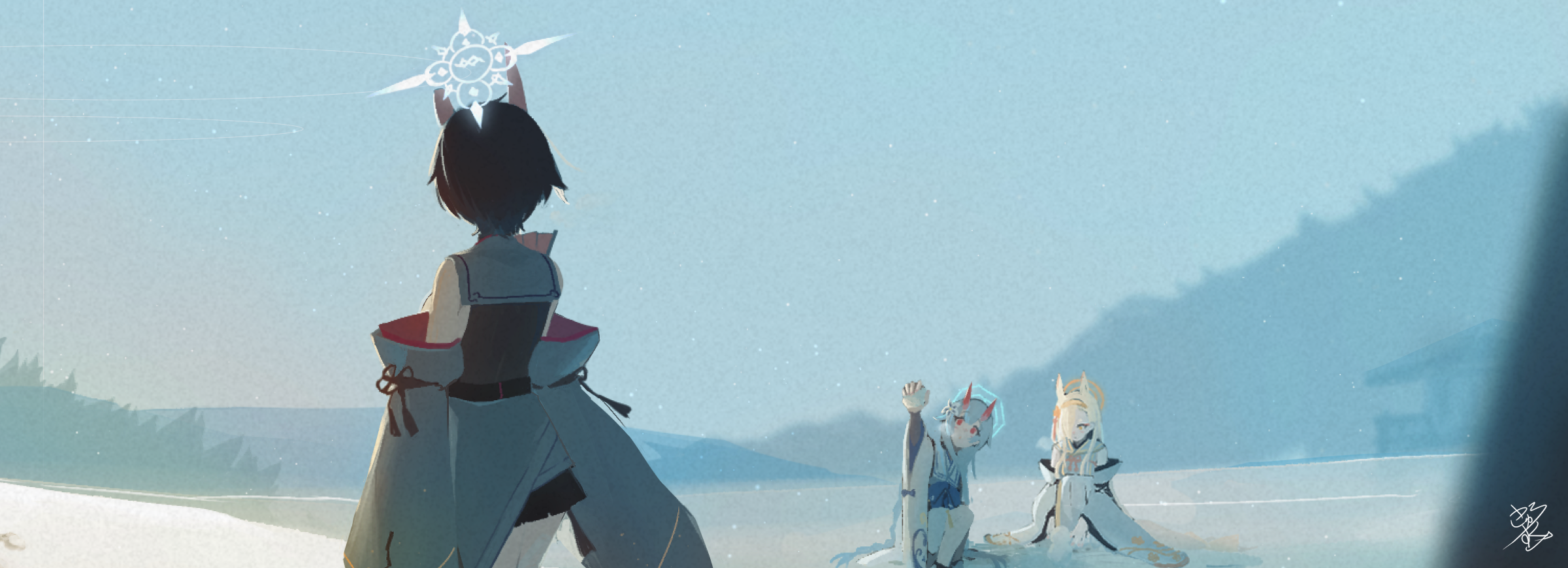 3girlsarm upblack hairblack skirtblonde hairblue halodetached sleevesfacing awayfrom behindhaloholdingholding snowballhornsjapanese clotheskimonolooking at anotherminiskirtmultiple girlsred eyesshort hairsignatureskirtsleevelesssleeveless kimonosnowballwhite halowhite kimonowide sleeveswinteryellow eyesyellow halo