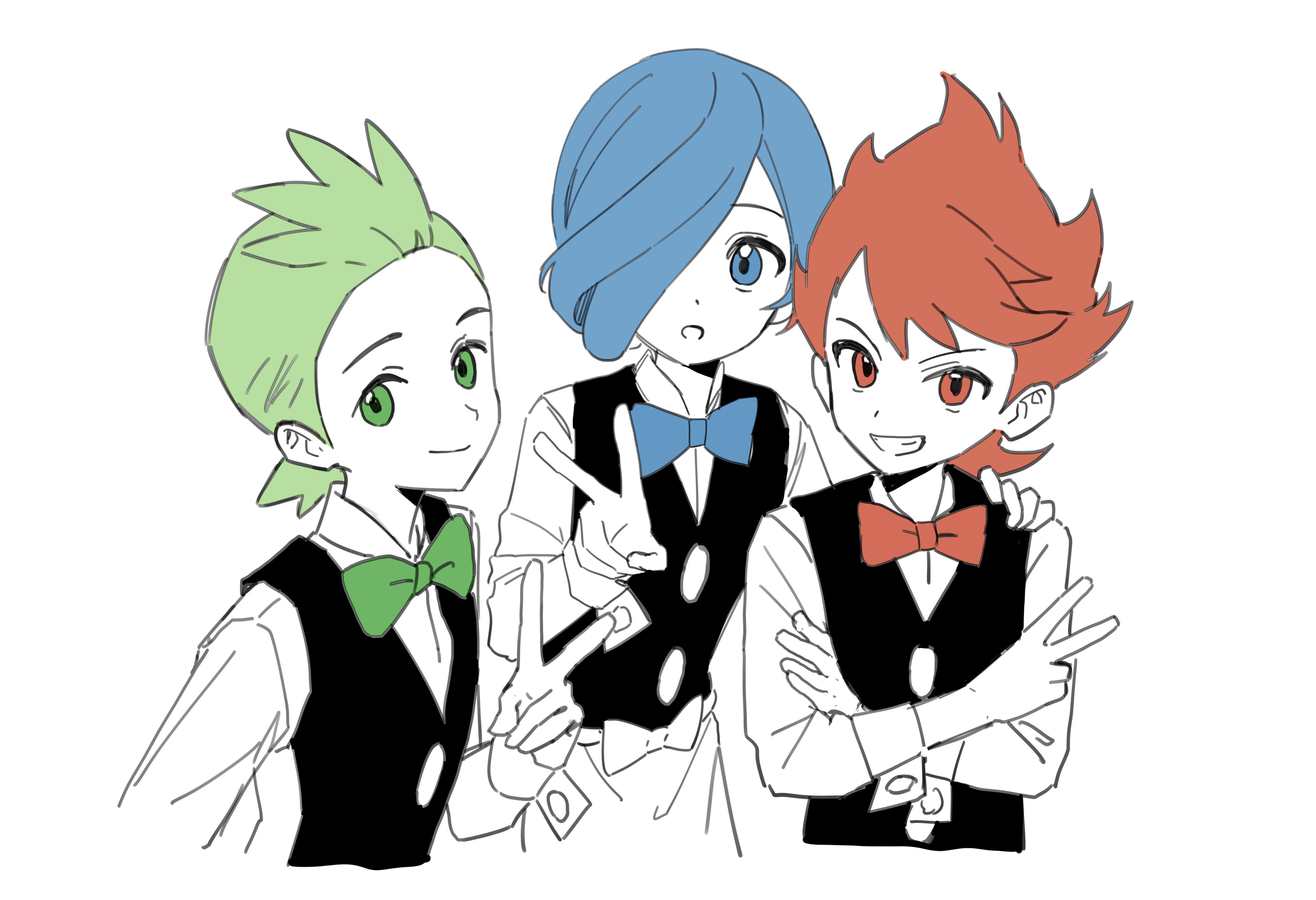 3boysblack vestblue bowblue bowtieblue eyesblue hairbowbowtiebrothersclosed mouthgreen bowgreen bowtiegreen eyesgreen hairgrinhair over one eyehand on another's shoulderhand uplong sleevesmale focusmultiple boysshirtsiblingssimple backgroundsmileteethvvestwhite backgroundwhite shirt