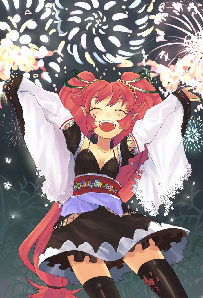:d:oaerial fireworksarms upblack thighhighsclosed eyesdressfireworkshappylong hairopen mouthoutstretched armsred hairsmilesolothighhighstwintailsvery long hairwide sleeveszettai ryouiki