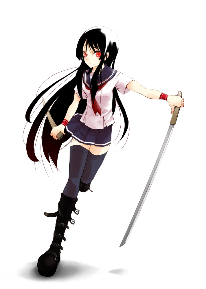 black hairbootsknee bootslong hairred eyesschool uniformserafukusheathskirtsoloswordthighhighsvery long hairweaponwristbandzettai ryouiki