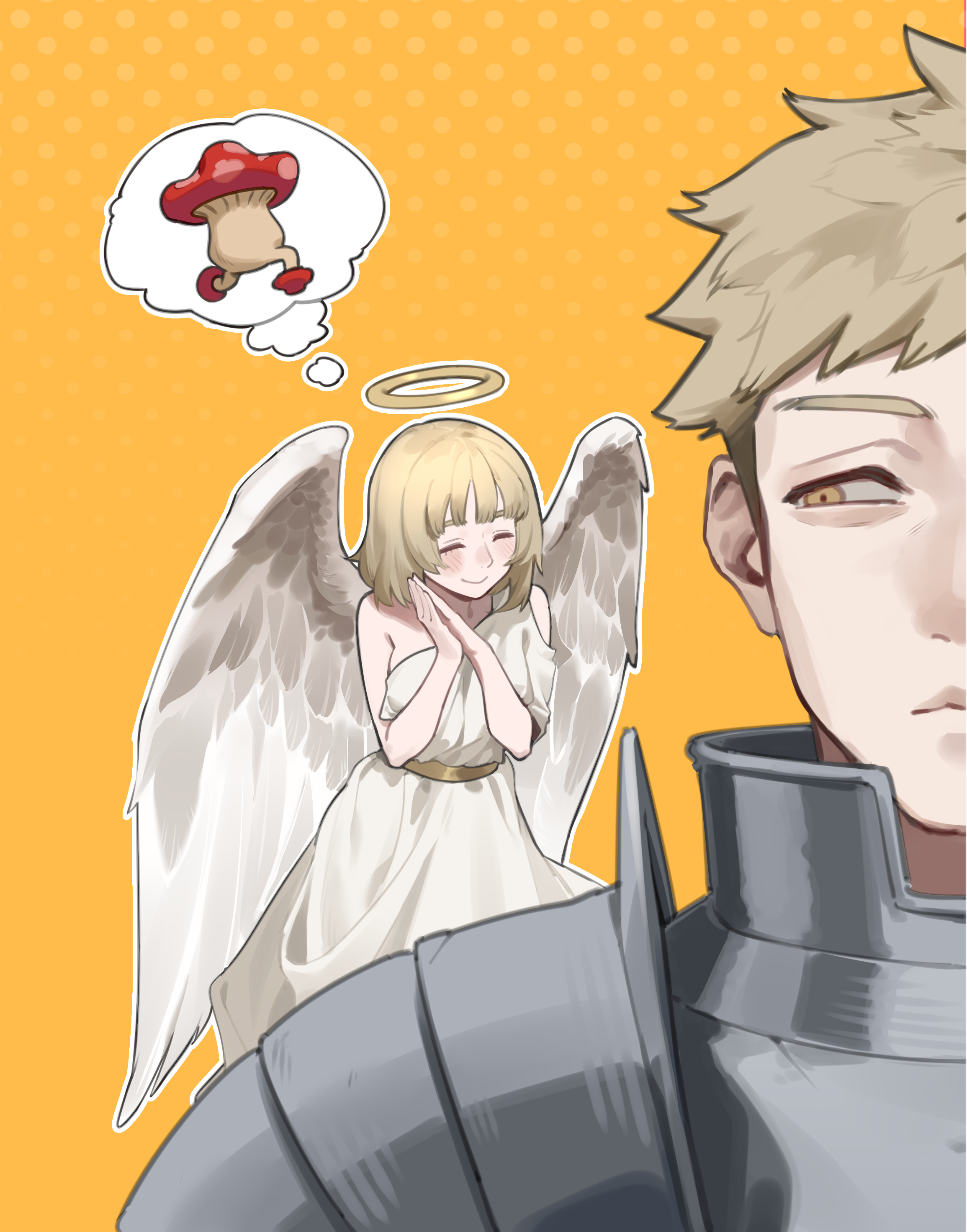 1boy1girlangelarmorbare shouldersblonde hairbreastplatebreastsbrother and sisterdresshalolarge breastsmedium hairmushroomoutlineshort hairsiblingsspeech bubblethought bubblewhite outlinewingsyellow background