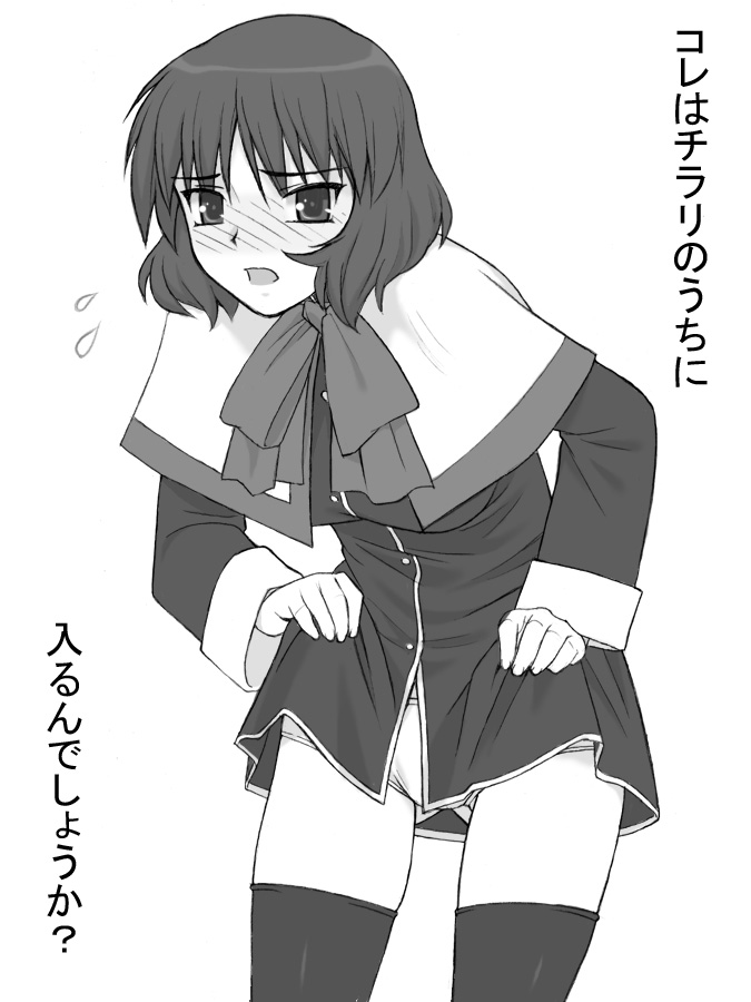 1girlblushclothes liftfemale focusgluteal foldgreyscalejapanese textmonochromepantiesschool uniformsimple backgroundskirtskirt liftsolothighhighsunderwear