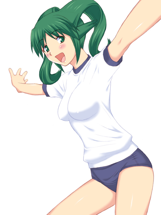 00s1girlblue eyesbreastsburumacovered erect nipplesfemale focusgreen hairgym uniformmedium breastsoutstretched armssimple backgroundsolospread arms