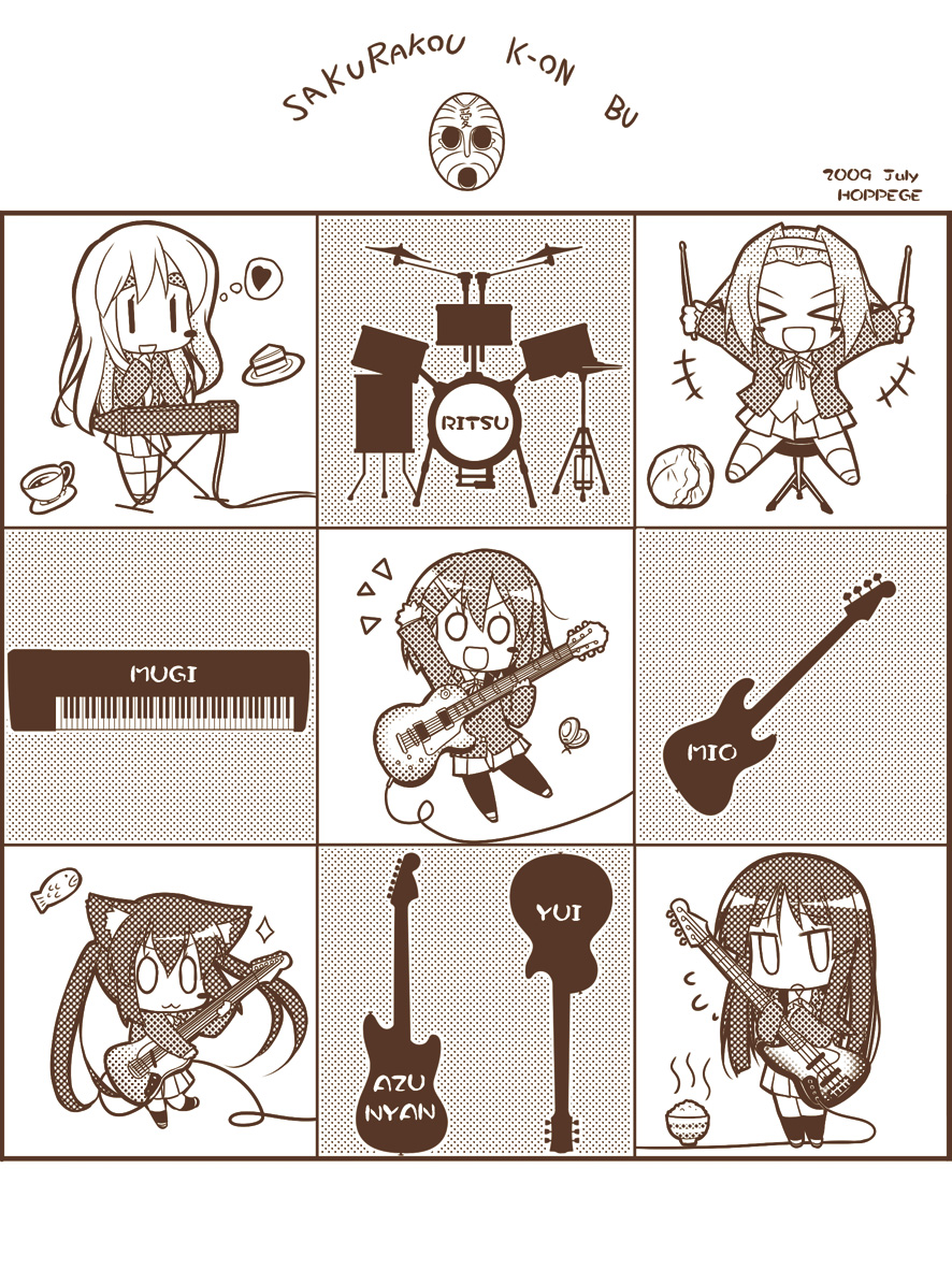 :300s1boy5girlsbowlbrown themecakecastanetschibiclosed eyescupdrumdrum setdrumstickselectric guitarfishfoodgibson les paulguitarhalftoneheartho-kago tea timeinstrumentkeyboardkeyboard (instrument)lettucemaskmonochromemultiple girlsmustang (guitar)o opantyhosepastryricerice bowl