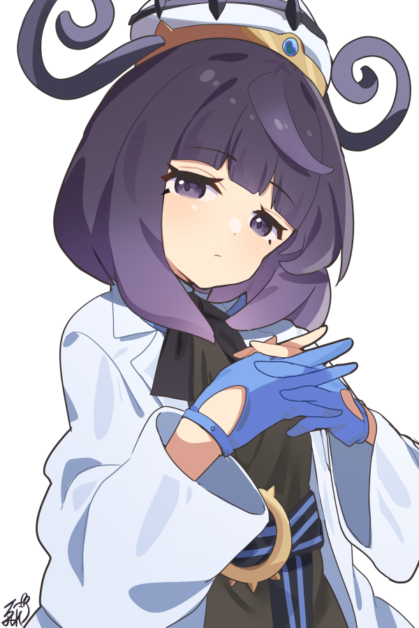 1girlbeltbelt buckleblack dressblue glovesbob cutbuckleclosed mouthcoatdressgloveshatinterlocked fingerslong sleeveslooking at viewero-ringo-ring beltopen clothesopen coatpartially fingerless glovespurple eyespurple hairshort hairsoloupper bodywhite background