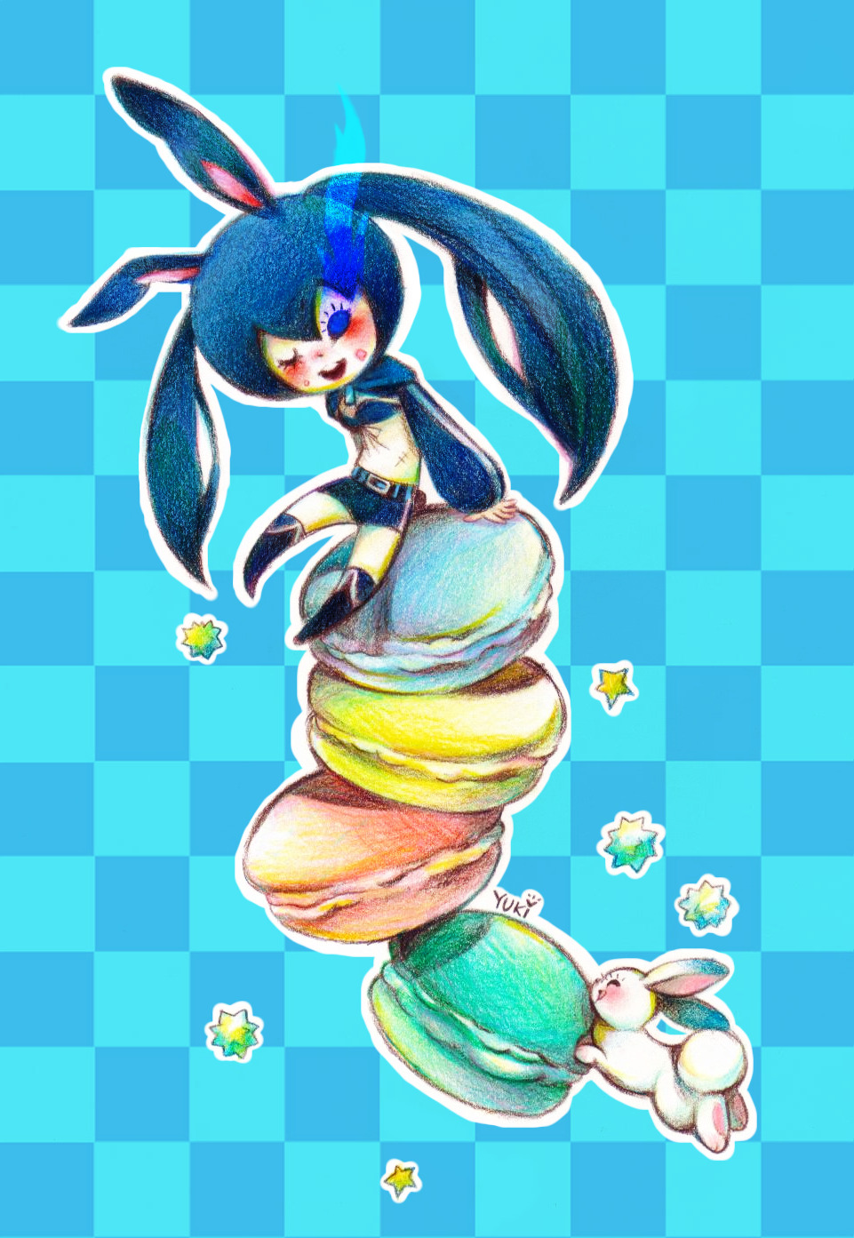 10s1girlanimal earsbikinibikini top onlyblack hairblue eyesbootscandychibicoatfemale focusfoodglowingglowing eyeskonpeitoulong hairmacaronmacaroonmidriffone eye closedpastryrabbitrabbit earsscarshortssmilesoloswimsuittwintailswink