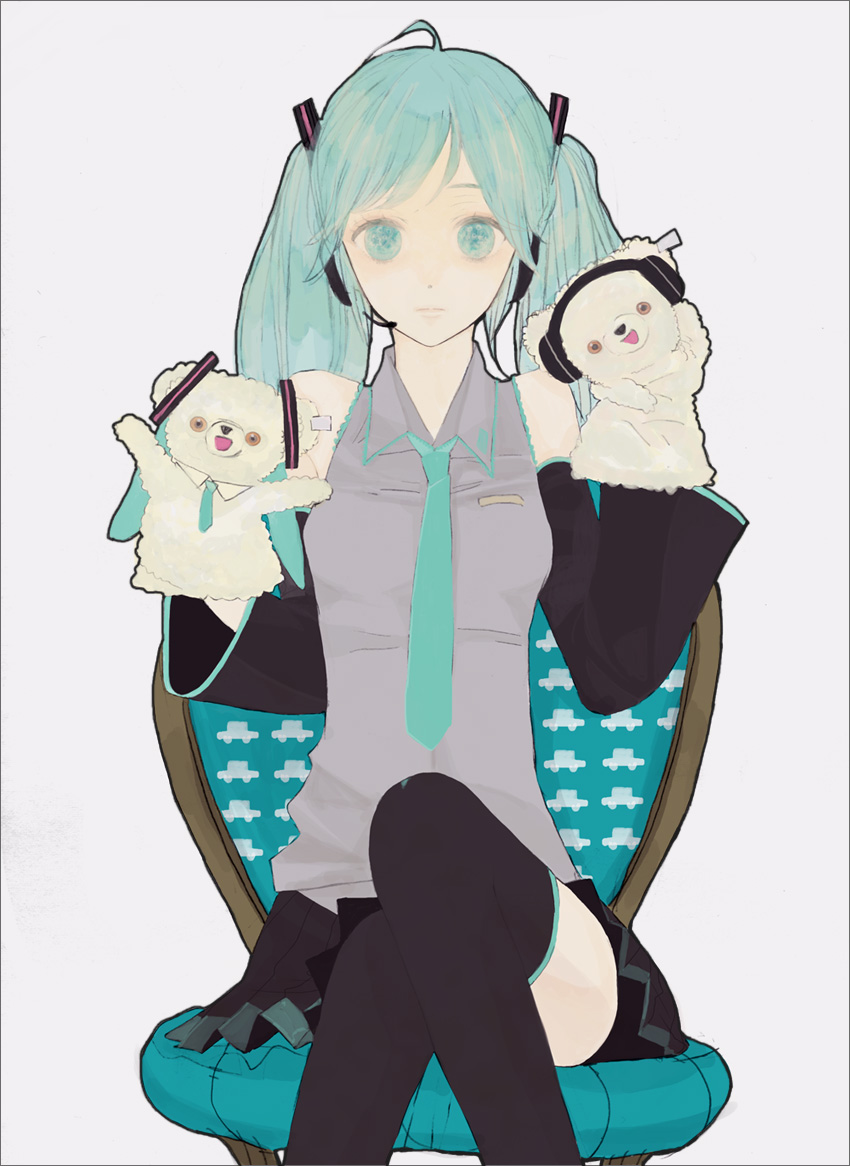 ahogeaqua eyesaqua hairdetached sleevesheadphonesheadsetlong hairnecktiepuppetsittingskirtsolothighhighstwintailszettai ryouiki
