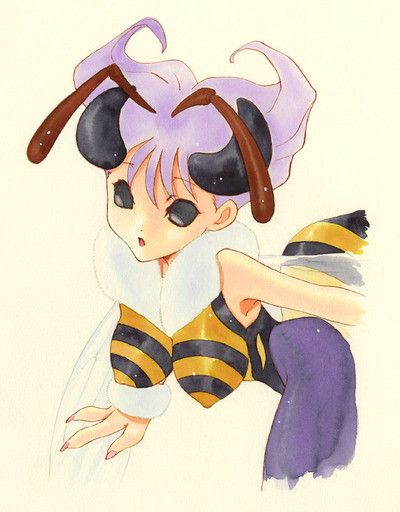 1girlantennaearthropod girlbeebee girlblack eyesbreastsbugfemale focusmonster girlno pupilspurple hairshort hairsolid eyessolowings