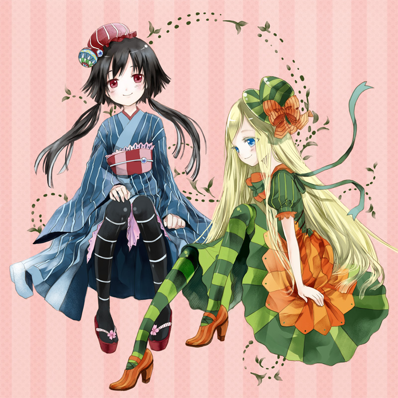 2girlsblack hairblonde hairblue eyesdresshatjapanese clotheskimonololita fashionmini hatmini top hatmultiple girlsred eyesribbonsittingsmiletop hatwa lolita