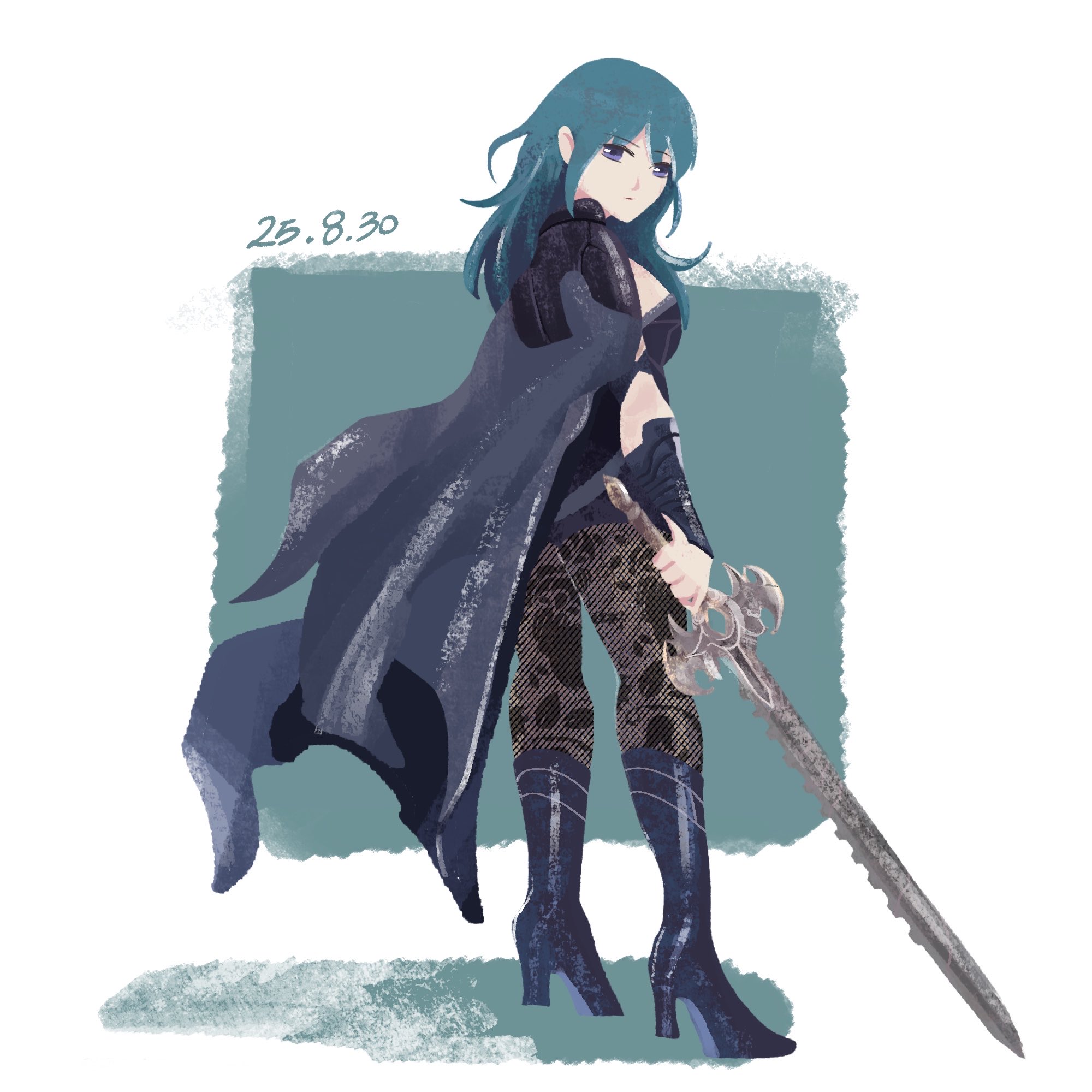 1girlarmorassblack armorblack bootsblack bridal gauntletsblack capeblue eyesblue hairbootsbreastsbridal gauntletscapeclo4klh86lbjbhyclosed mouthclothing cutoutfrom behindfull bodyhigh heel bootshigh heelsholdingholding swordholding weaponlooking at viewermedium breastsnavelnavel cutoutpantyhosepatterned legwearsolostandingswordweapon