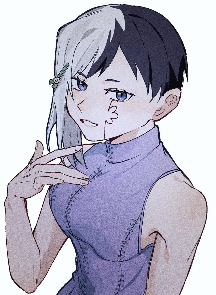 1girlasymmetrical hairbare shouldersblack hairblue eyesbreastsgenderswapgenderswap (mtf)grinhair ornamenthaircliphand uplooking at viewermulticolored hairpurple eyespurple shirtshirtshort hairsleevelesssmilesolosplit-color hairtwo-tone hairupper bodywhite backgroundwhite hair