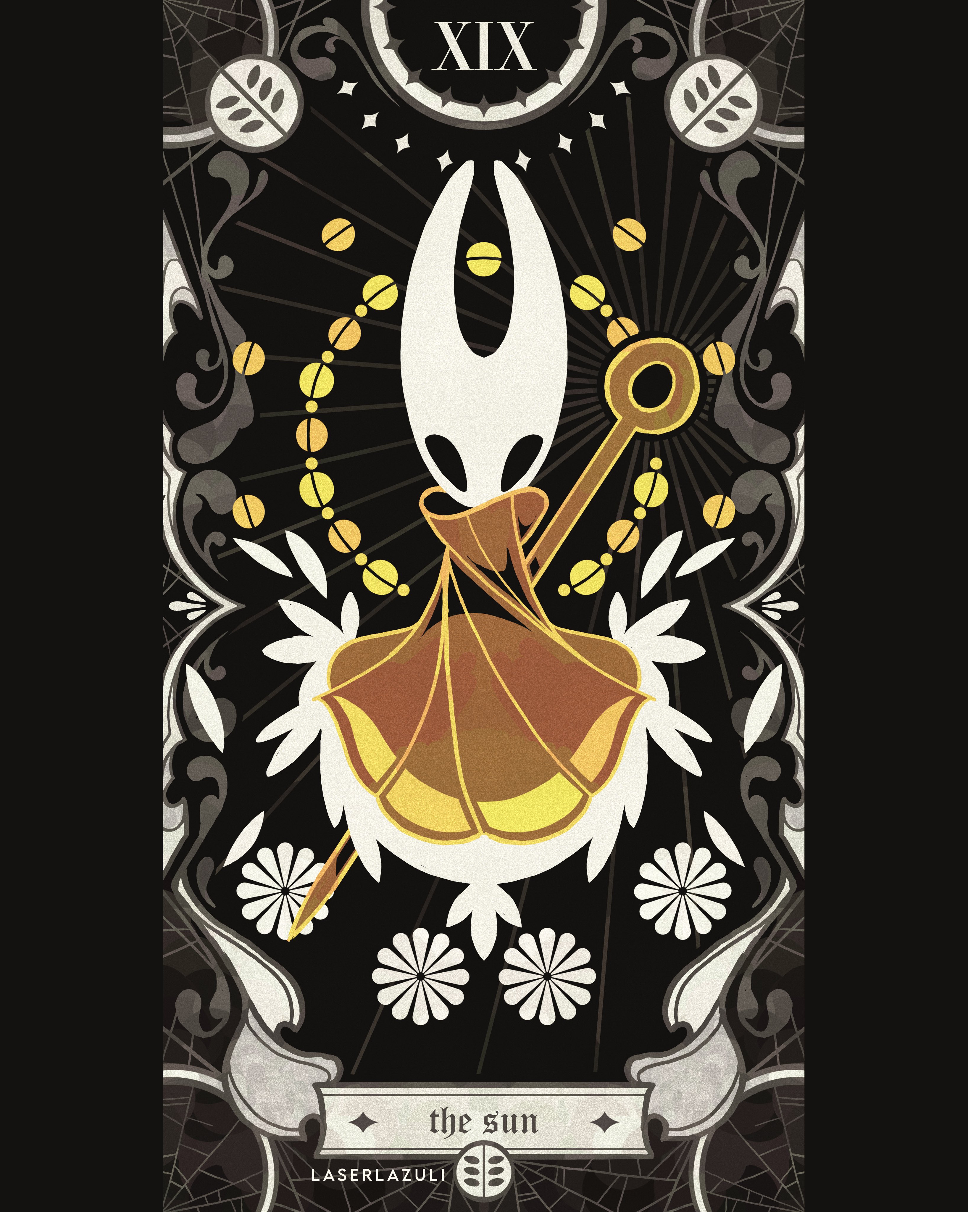 1boy1girlantennaearthropod girlartist nameblack eyescard (medium)cloakenglish textfull bodyhollow eyeshorned maskmaskneedle (hollow knight)pillarboxedsilksolospider webspot colortarottarot (medium)the sun (tarot)weaponweapon on backwhite mask